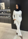 Designed for effortless sophistication, this two-piece set features a softly textured long-sleeve top paired with matching wide-leg pants. The top is finished with an elegant layered wrap detail, secured with a removable brooch that adds a refined touch while allowing versatile styling. Crafted for comfort and fluid movement, this set offers a modest yet modern silhouette perfect for both everyday wear and elevated occasions.
